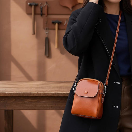 Compact Vertical Leather Crossbody Bag – Genuine Cowhide Phone Shoulder Purse with Flap Pocket for Women